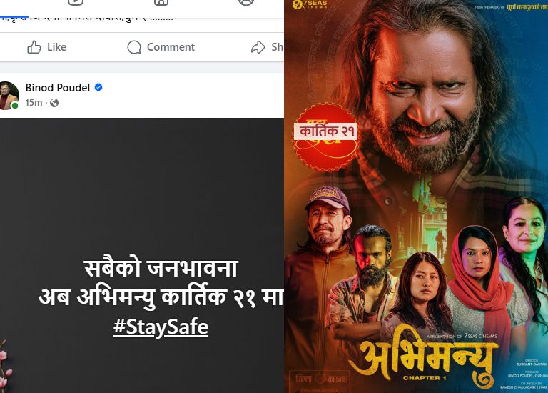 काठमाडौं । चलचित्र ‘अभिमन्यु : च्याप्टर १’ पुनः सरेको छ । असोज २४ गतेबाट रिलिज हुने भनिएको चलचित्र अब कार्तिक २१ गतेदेखि प्रदर्शनमा आउने भएको छ । अहिलेको प्रतिकुल मौसम र देशमा आएको संकटलाई मध्ये नजर गर्दै रिलिज मिति सारिएको निर्माण टिमले बताएको छ।