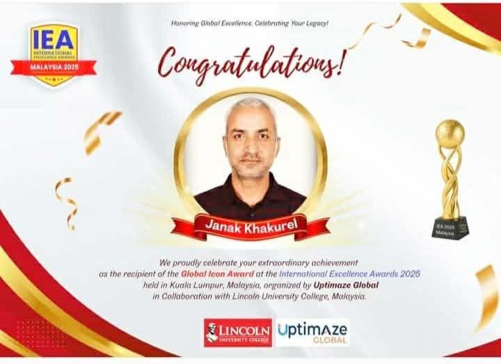 काठमाडौँ। नेपाली चलचित्र निर्देशक तथा लेखक जनकराज खकुरेललाई मलेसियाको क्वालालम्पुरस्थित लिंकन युनिभर्सिटी कलेजमा आयोजित अन्तर्राष्ट्रिय उत्कृष्टता पुरस्कार (IEA) २०२५ मा ‘ग्लोबल आइकन अवार्ड’ द्वारा सम्मानित गरिएको छ।