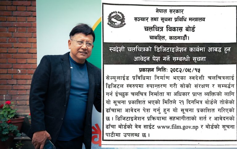 काठमाडौँ । नेपाल सरकार, सञ्चार तथा सूचना प्रविधि मन्त्रालयअन्तर्गतको चलचित्र विकास बोर्डले स्वदेशी चलचित्रको डिजिटाइजेशन कार्यका लागि आवेदन आह्वान गरेको छ।