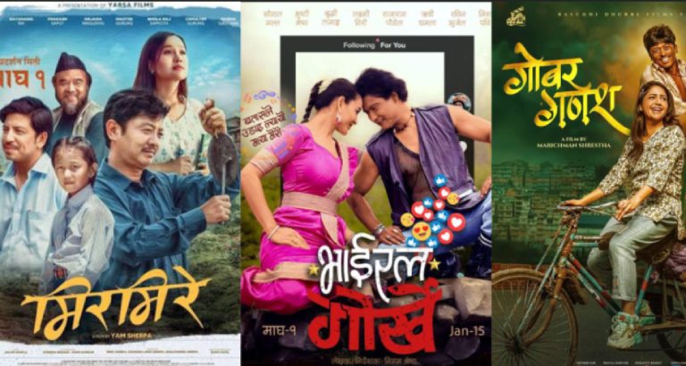 काठमाडौं। माघे संक्रान्तिको अवसरमा आजबाट तीन नेपाली चलचित्र एकसाथ प्रदर्शनमा आएका छन्। पारिवारिक र पर्वको माहोललाई लक्षित गर्दै ‘मिरमिरे’, ‘गोबर गणेश’ र ‘भाइरल गोर्खे’ हलमा पुगेका हुन्।